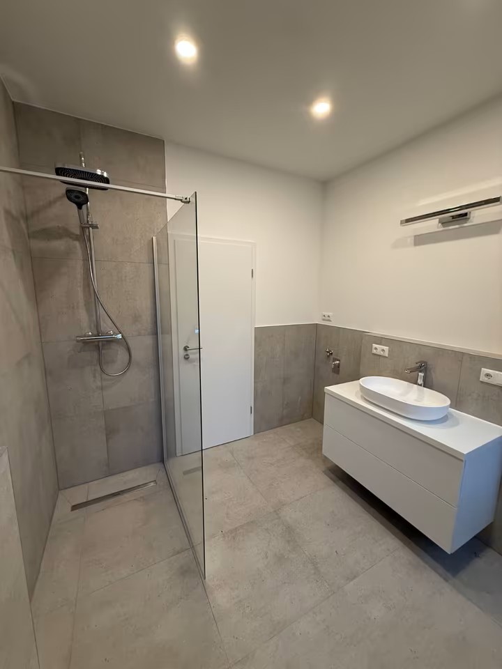 Kompletter Rückbau des alten Bads bis auf den Rohbau. Neuaufbau mit modernen Cremefliesen, neuer Dusche und zeitloser Ausstattung.