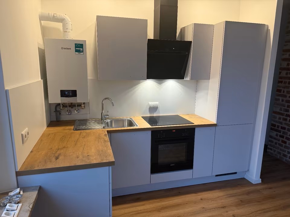 Grundsanierung einer 2-Zimmer-Wohnung: neues Bad mit Regendusche und Geberit-WC, Designvinyl, komplette Elektrik und freigelegte Klinkerwände. Altbau-Charme trifft moderne Qualität.